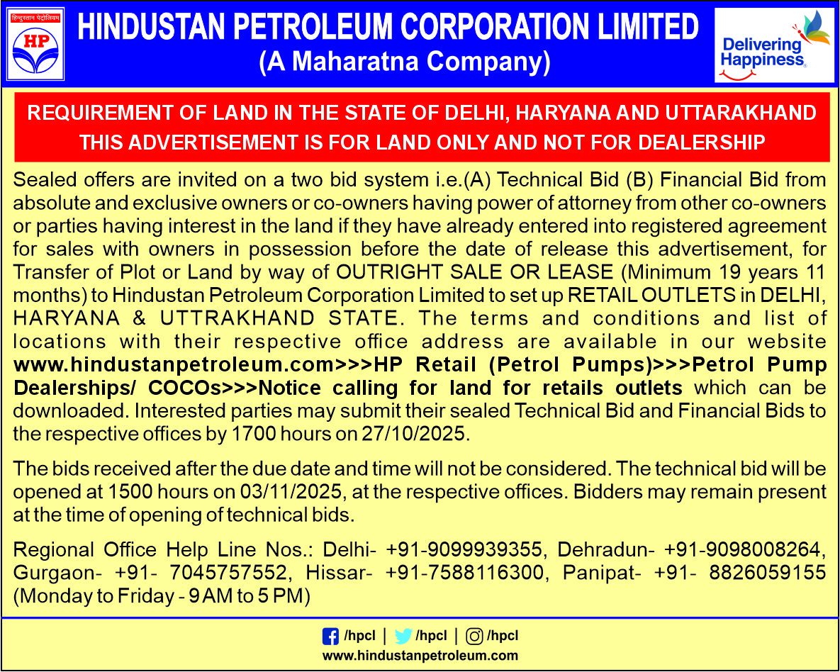 Advertisement for Land for retail outlets in the states of UP, Bihar & UK
